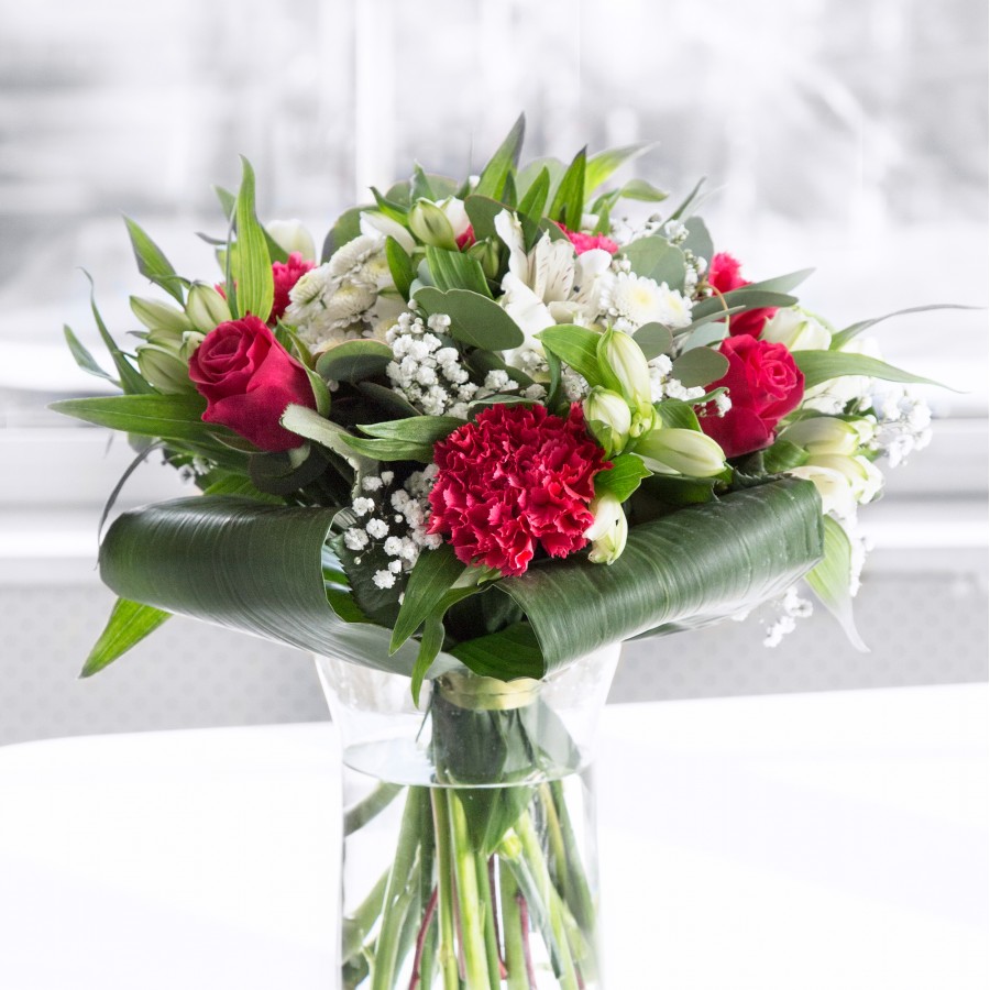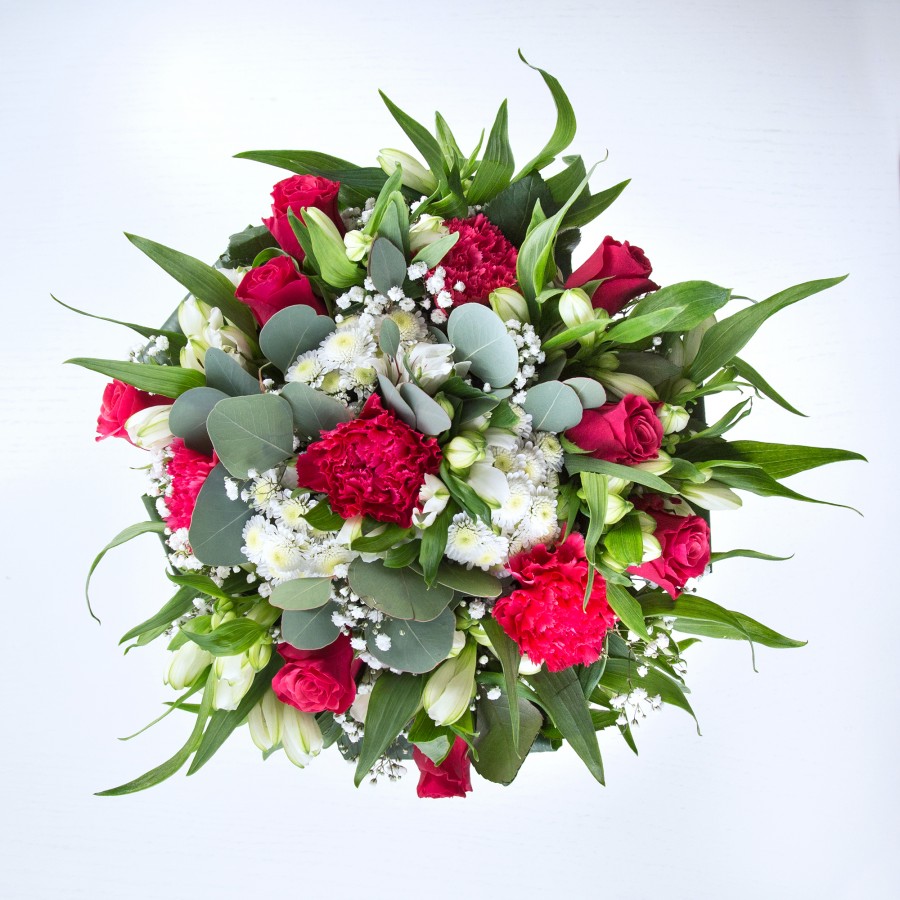Revitalize your space with our vibrant bouquet, a stunning display that combines classic beauty with modern sophistication. This arrangement features a delightful cast of white chrysanthemums, ethereal gypsophila, bold red roses, and elegant carnations, complemented by white alstroemeria and rich aspidistra leaves. Each flower is meticulously hand-selected, ensuring an arrangement that radiates premium quality and freshness.